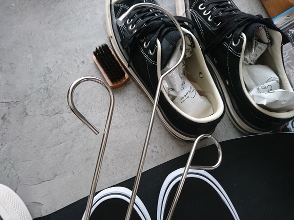 スニーカーを吊るして飾ったり、収納に使ってもいいと思えるハンガーでした。